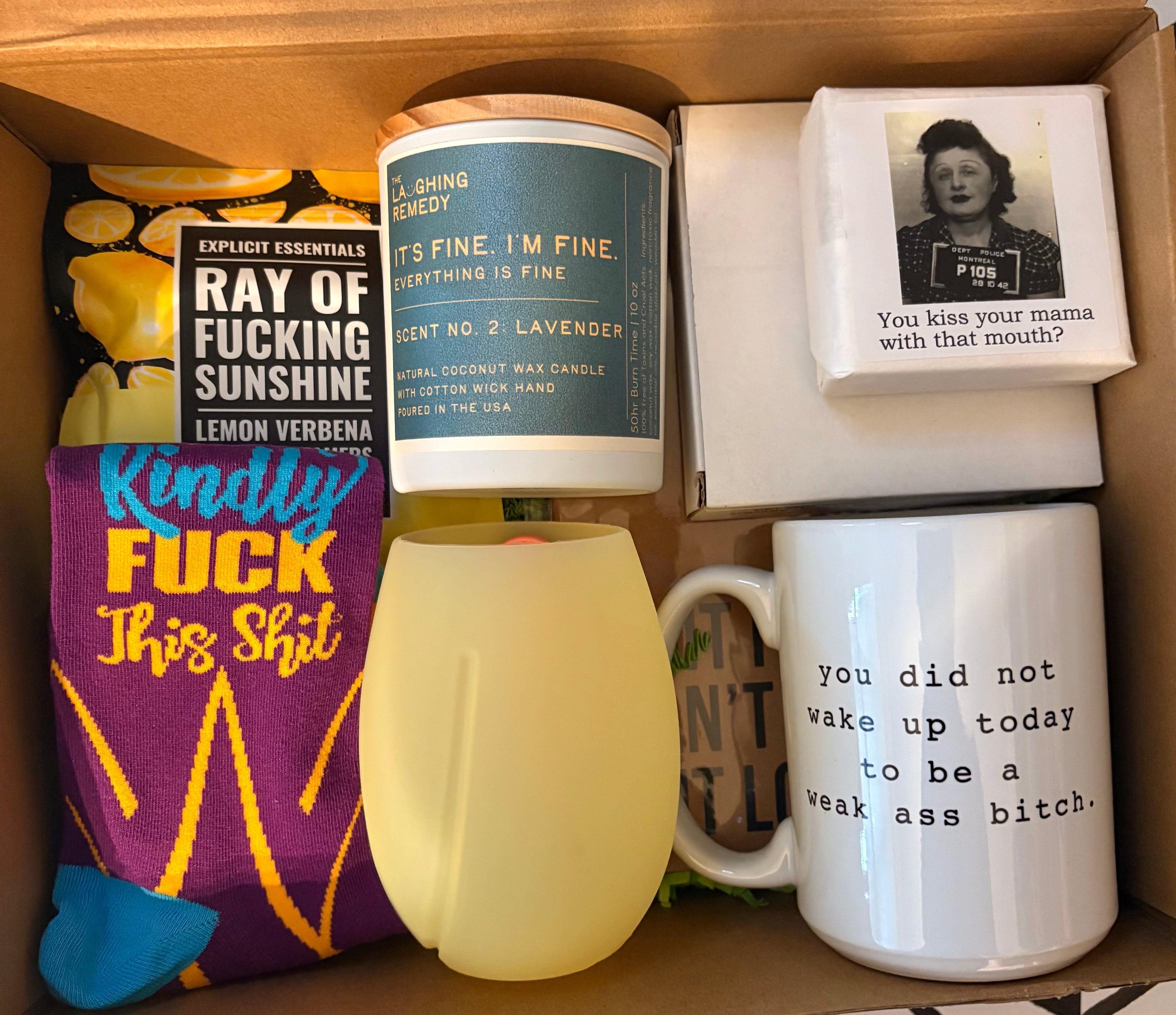 Each Remedy Box is a handpicked prescription for life’s chaos — a mix of calming, sassy, and oh-so-necessary goodies designed to make you laugh, breathe, and remember you’ve got this. No boring self-care here — just a dose of joy!